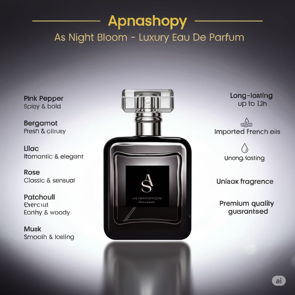 As Night Bloom(50ml): Bold & sensual with notes of pink pepper, bergamot, rose & patchouli.